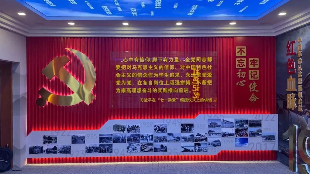 展館以黨建文化為主題,分別以“不忘初心、牢記使命”、“紅色血脈”、“紅色記憶”、“紅星閃耀”、“搏擊長(zhǎng)空”5大展項(xiàng)展開闡述黨與軍人的故事。